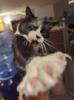 Description: A tuxedo cat with his mouth open and one clawed paw outstretched toward the camera